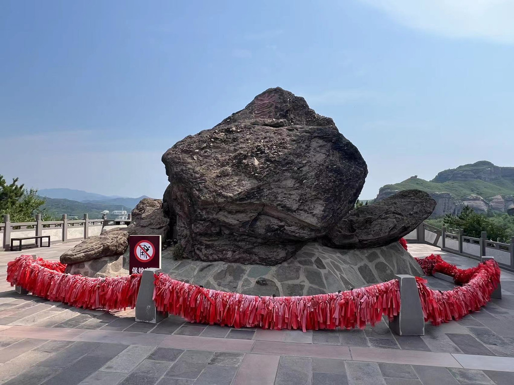 金龟石:龟背上镌刻寿字,又称长寿石。此龟是双塔山北峰上的巨石,自然脱落堆积而成的龟状,高4.7米,宽6.8米,大自然用它的神奇之手将七块巨石摆成一只龟状,因而得名。每当夕阳夕照时,石龟通身一片金黄,引颈仰望,又似在双塔山脚下虔诚地跪拜,故又称“金龟拜塔”。