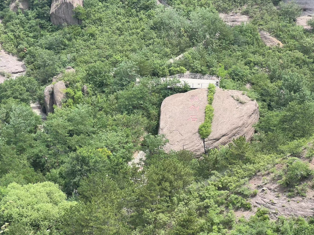 试剑石:在情人崖山脚下,长20米,宽17米,上面平如碾盘,中间一道裂缝把巨石一分为二,似刀劈斧剁一般,传说这就是吕洞宾斩蛟之前的试剑石。