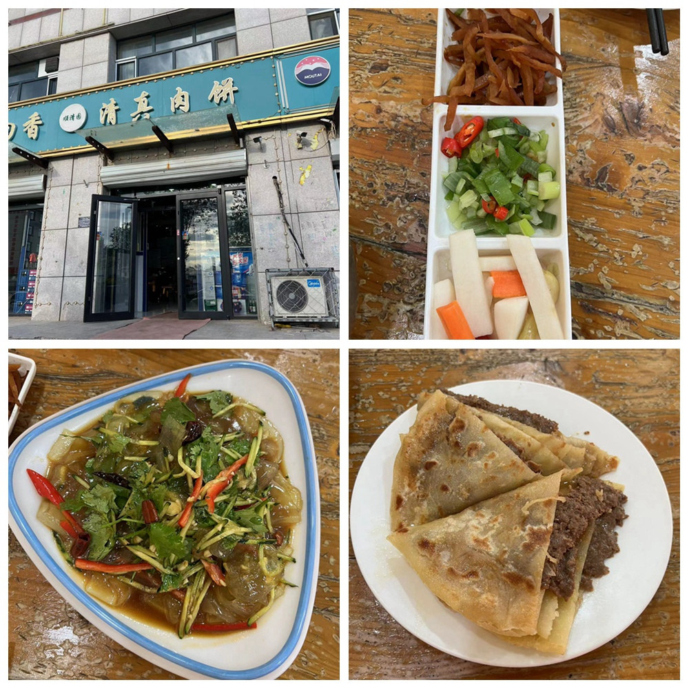 沽源县:回回香清真肉饼。推荐。一张牛肉饼,一个拉皮,一瓶半斤装白酒,共计59元,赠送的小菜,中间是拌葱,小菜很好,解腻。