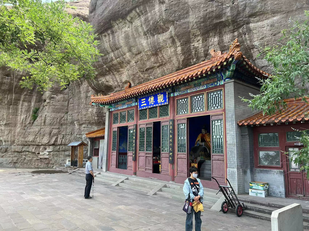三仙观:沿右侧前行有三间依山而建的三仙观,观体紧挨崖壁。观内从左至右供奉武财神赵公明、文曲星文昌帝君、药王孙思邈。