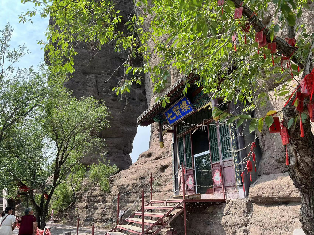 七宝楼:北峰东侧一座依岩而建的佛教洞观,利用双塔山北峰东侧自然形成的大小不等的蜂窝状孔洞,供奉观音菩萨和善财童子的53位仙师。仙师们不分座次,前后高低错落有致,一派详和氛围。最大的人物塑像高1米,最小的高仅7厘米。
