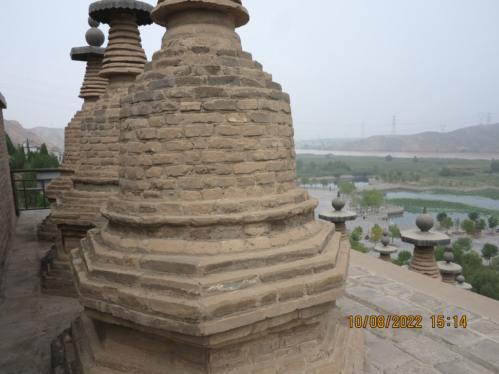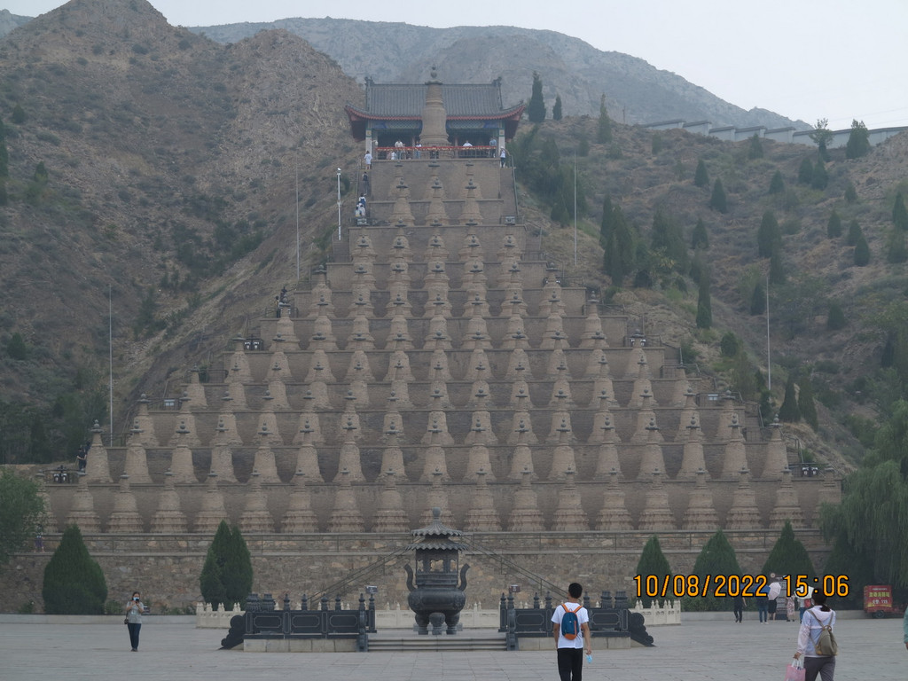 三个小时的游览最后到108塔,这个是古迹,是始建于西夏时期的喇嘛式实心塔群,塔群随山势凿石分阶而建,共分十二阶梯式平台,由下而上逐层增高,依山势自上而下,按1、3、3、5、5、7、9······的奇数排列成十二行,形成总体平面呈三角形的巨大塔群,总计一百零八座,因塔数而得名。登上最高处,可以看看黄河,风光不错。