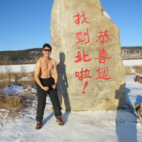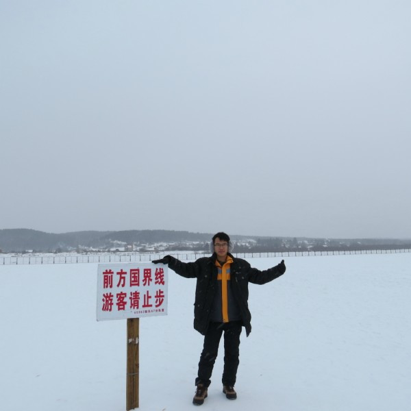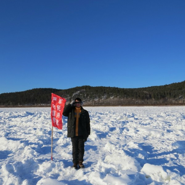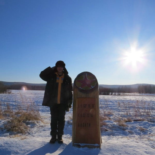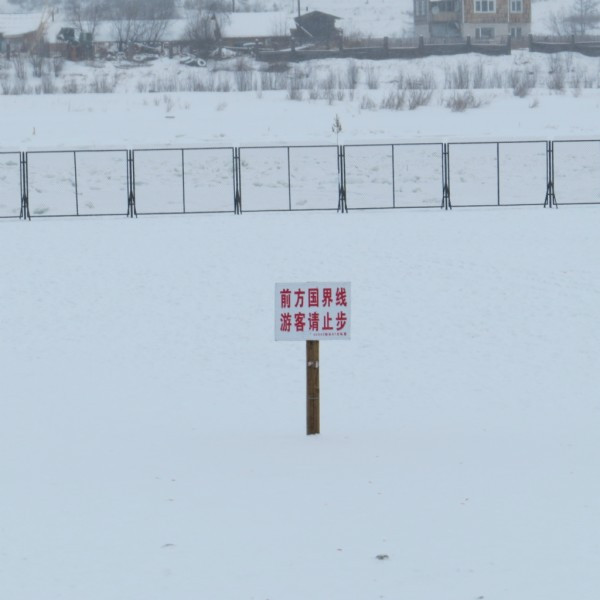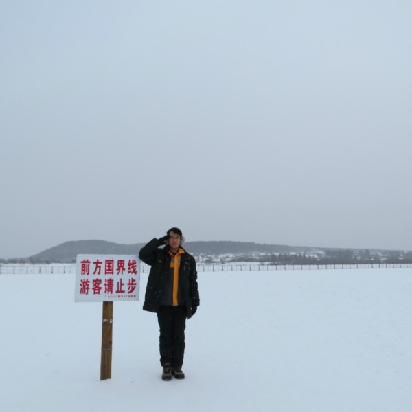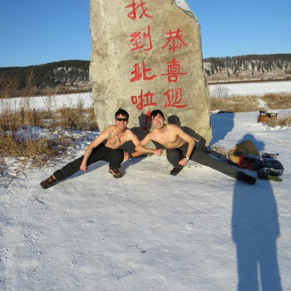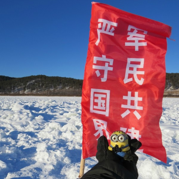其实我们那个时候都拍完了,大家都嫌冷,五个人都回去了,我和老小觉得既然到边境了就要走到最边上才有意义,才有了上面扯旗的照片。然后我又要给我的小黄人照相,才又从河面上回到了这个地标这,然后就碰到了石头后面一行三个人在脱衣服让我们帮忙照相,然后我们才有了脱衣服这个想法