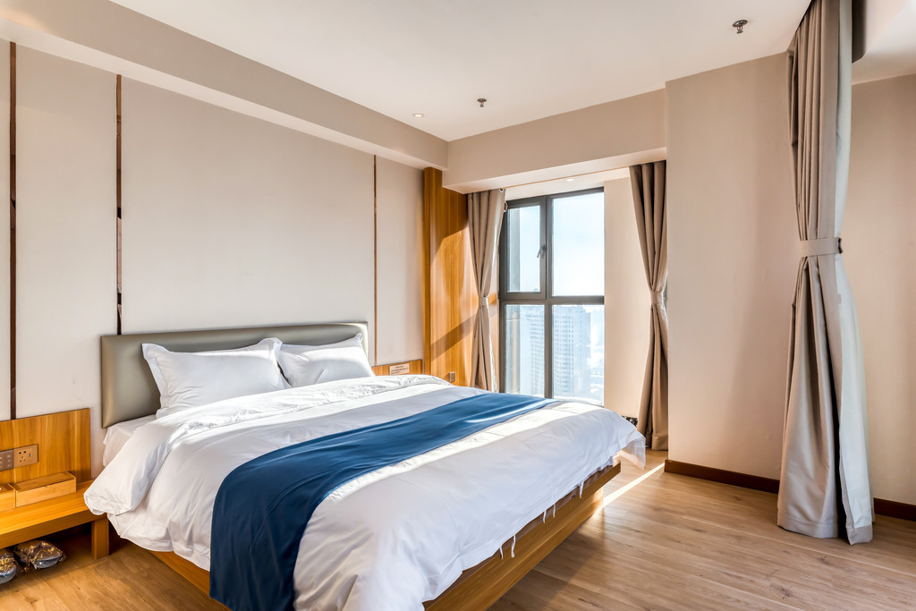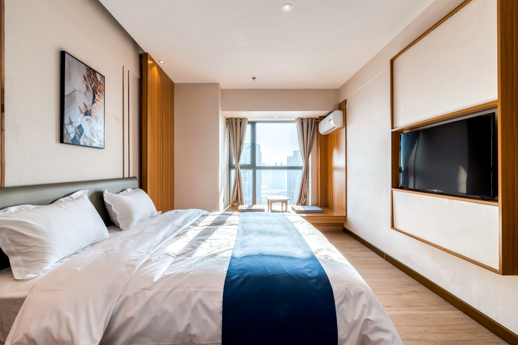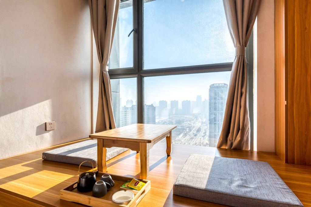 酒店常年无死角释放负氧离子,以健康环保为主题,选用全国首创的制氧泥环保新型装修材料,夏天恒温,冬季保暖。天然氧负离子,助于睡眠,净化室内空气,无异味。落地窗的设计还很适合喝茶欣赏城市美景。