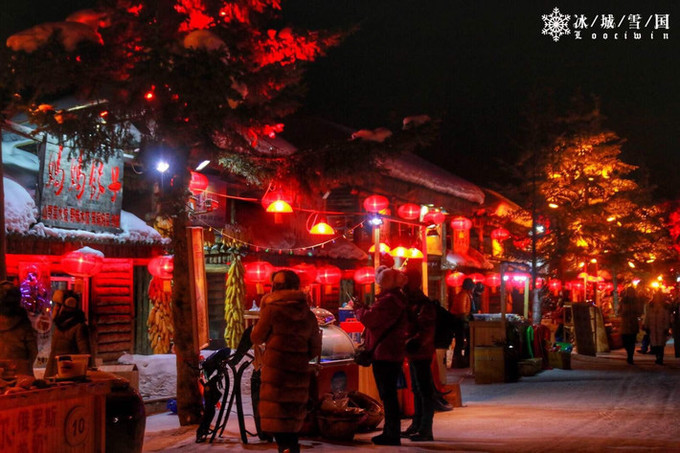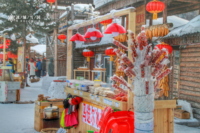 亮了灯的房子还是静悄悄的,静谧而美丽。晚上的韵大街可热闹了,到处都是喜气洋洋的,你不妨光顾一下路边卖力吆喝的小摊,尝尝当地的特色。大自然就是最好的电冰箱,所有水果都摆在了外面摆卖,我也买了一点冷桃子尝一尝,咬在嘴里完全冻僵了,牙根本就咬不动,看来我还是吃不了那么冷的冰水果。还有许多特色,比如说当地产的蓝莓干,也可以买一点来尝尝。冰冻樱桃,整一颗放到嘴里,牙齿都不会动了,红红的在灯光照耀下特别晶莹剔透。雪乡第二天一早在雪乡闲逛,在冰冷的雪天里给自己寄一张意义非凡的明信片。