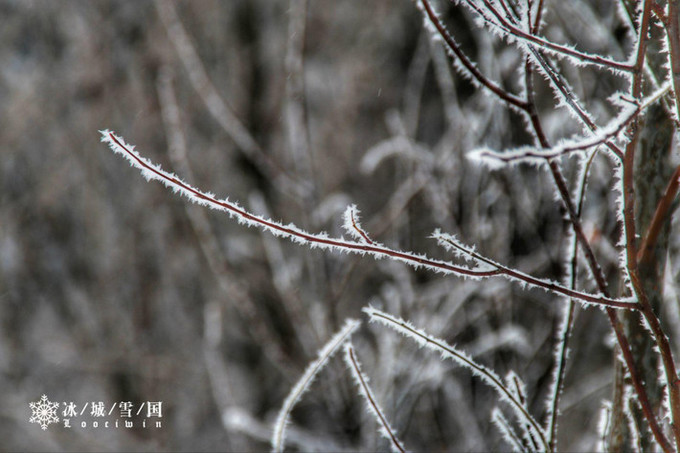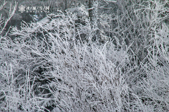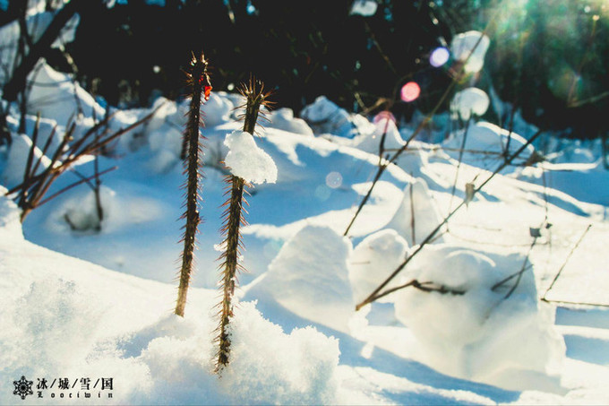 之前就听说过如果天气太冷会在睫毛上冻住雪,果然是真的好神奇。路上的雪堆特别柔软,轻轻抓上一把,向空中一甩,雪花犹如天女散花般从天而降。我还特意拿了一点放到嘴里尝尝,有种吃冰沙的感觉,当时还在想如果加点什么调味酱应该就成了太晚绵绵冰了吧。我实在玩得太开心,看到哪里有雪哪里就随手抓一把,根本停不下来,这就是南方人第一次看到雪的样子。树枝上的小冰晶在阳光照射下透明发光路上遇到不少红色的灯笼,一方面增添了喜庆的气氛,另一方面可以指引道路不容易迷路。大概走了一个半小时平路以后,就会开始有爬坡的路,翻越羊草山才刚刚开始,不要着急,越到后面坡度越大。不用担心会迷路,因为地上都是人们踩过雪地的痕迹,基本上道路都会用雪摩托走过一遍来开辟登山的道路。对于穿越我的建议是不要走几步路就想坐着休息,因为这样会形成惰性而且增加了徒步时间,必须要在天黑赶到雪乡,不然就会很危险。可以放慢脚步,但不要轻易停止,实在坚持不住,全程可以长的休息1到2次。越往上面爬,景色会越美。雾凇与树枝叶子完美结合,你不愿轻易触碰它,生怕打扰了这安静的一切。我忍不住与身后的雾松融入同一个画面中,不敢相信这是真实存在过。