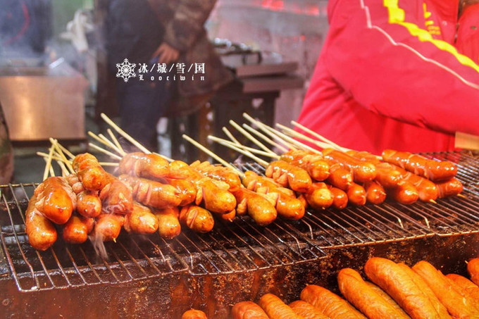 味道特别纯正。在冰天雪地里吃冰棍,虽然冷但是吃得很爽,一边吃嘴边还吐出冷气。红肠也是哈尔滨特色,路边的小吃摊有卖现烤红肠的,10元一根。