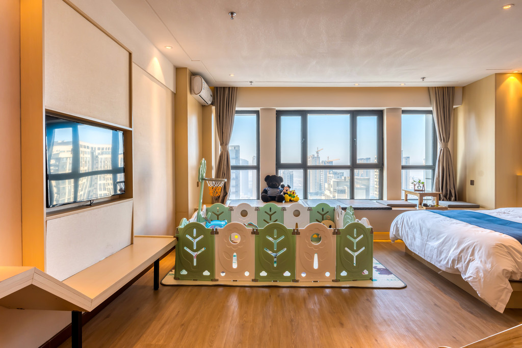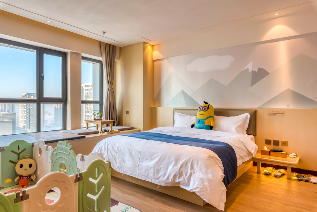 首先说说这两家酒店,两家酒店是同一家老板,所以在房型的设装修风格上,都很相似。房间面积宽敞,装修简约、温馨。梧桐负氧离子酒店这边,常年释放负氧离子,是一家以健康环保为主题的酒店。这次是我和我朋友来的,因为朋友带着孩子一起,所以入住了亲子房。视线透过落地窗向外张望,即可探见一派古典建筑模样。