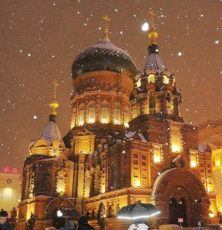 这个季节建议去中央大街,这是哈尔滨历史的见证,街道旁基本都是百余年的欧式建筑,建筑风格各异,晚上拍照的效果比白天好。接着就是索菲亚教堂,这是哈尔滨最美的东正教堂,里面是博物馆,展览的是以前哈尔滨的旧照片,还有一些建筑模型。在这里随便一拍就能出片。