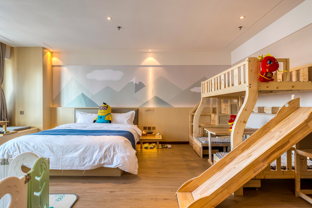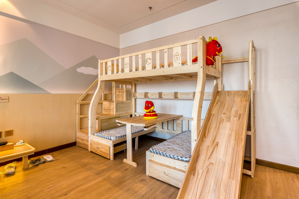 房间内除了有一张大床,还有一个上下床,可以入住四个人,房间内还有很多可爱的玩偶,木制的上下床还有滑滑梯,朋友的孩子玩得不知道有多开心。我也顺便感受了一番童年的快乐。