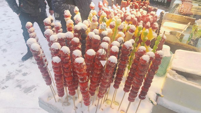 中央大街名声在外 哈尔滨 的冰糖葫芦,除了冻冰糖葫芦,还有很多种口味的,冻辣条,冻辣椒,冻鸡爪,我在这个摊子面前没有看到~