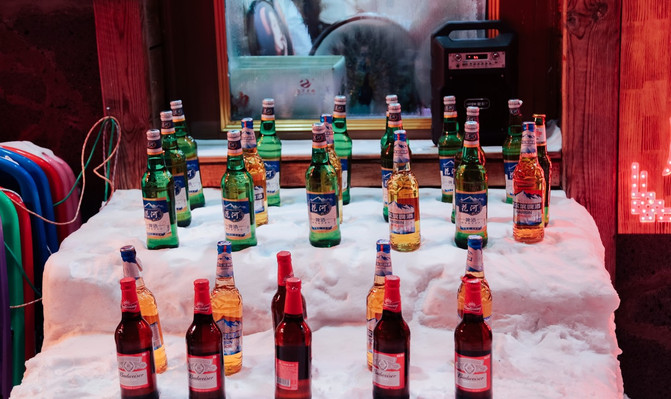 我记得有个段子,说的是“在 东北 ,如果你要常温啤酒,就是零下25度的;如果你要冰镇啤酒,才是零下5度的”这一瓶瓶摆放着的啤酒瓶啊,就很好的像我们印证了这个段子。