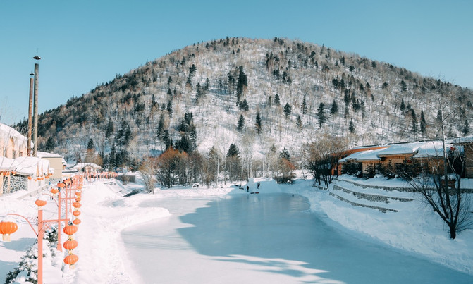 结冰的河道适合玩雪圈等项目,被太阳照射的松柏啊,也在山间拉长了身影。