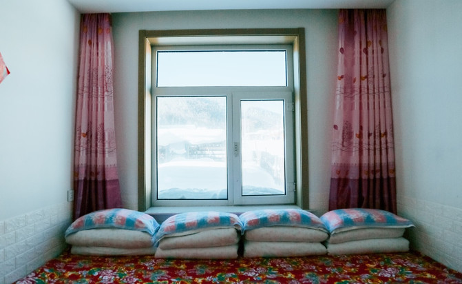 我们入住的是非常有 东北 特色的印花床单炕,这是一个四人间,所以提供了4个人的被褥枕头。