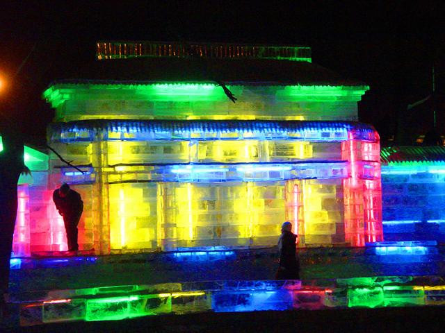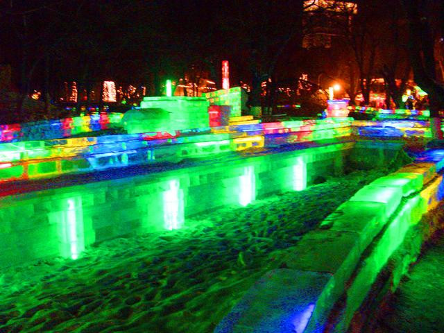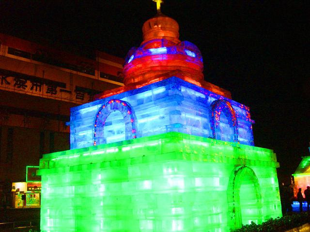 其实,冰雪旅游专列在哈尔滨最为重要的游览项目是观赏五彩缤纷的冰灯。由于天彻底黑下来才是观赏冰灯的最佳时节,所以在观览了中央大街与索菲亚教堂后,游客们最后才来到哈尔滨兆麟公园。