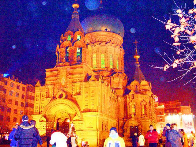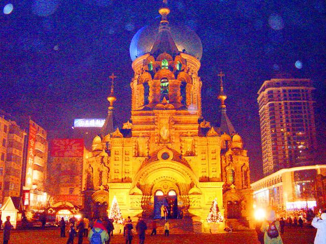 离开中央大街,旅游大客车载着游客们来到了哈尔滨著名的索菲亚大教堂。此时天已经完全黑了下来。虽说不是白昼,但索菲亚大教堂美丽的灯光夜景,仍然给人们一种美的视觉观感。索菲亚教堂景区位于美丽的松花江南岸,占地5万平方米,以其独特的建筑景观、异域风情闻名于海内外。