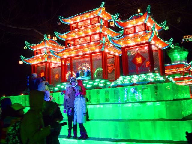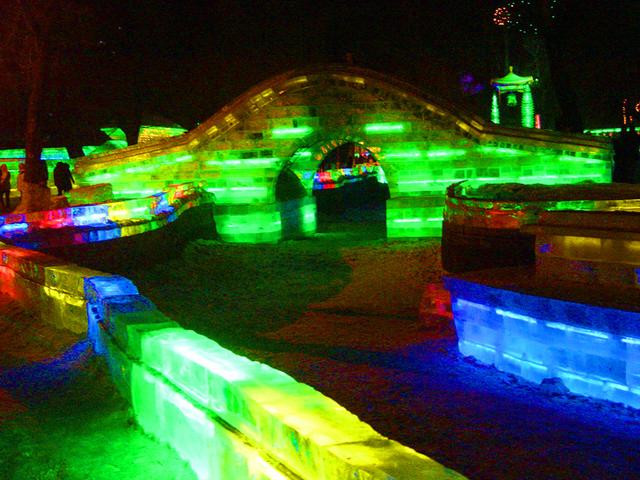 哈尔滨兆麟公园举办的冰灯游园会曾被评为我国35个“绝奇美胜”旅游景点之一,冰雪旅游专列旅游团刚好赶上今年在此举行的盛大冰灯艺术展。