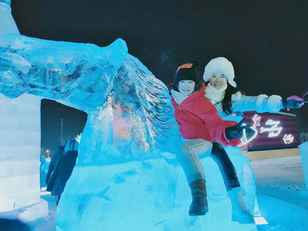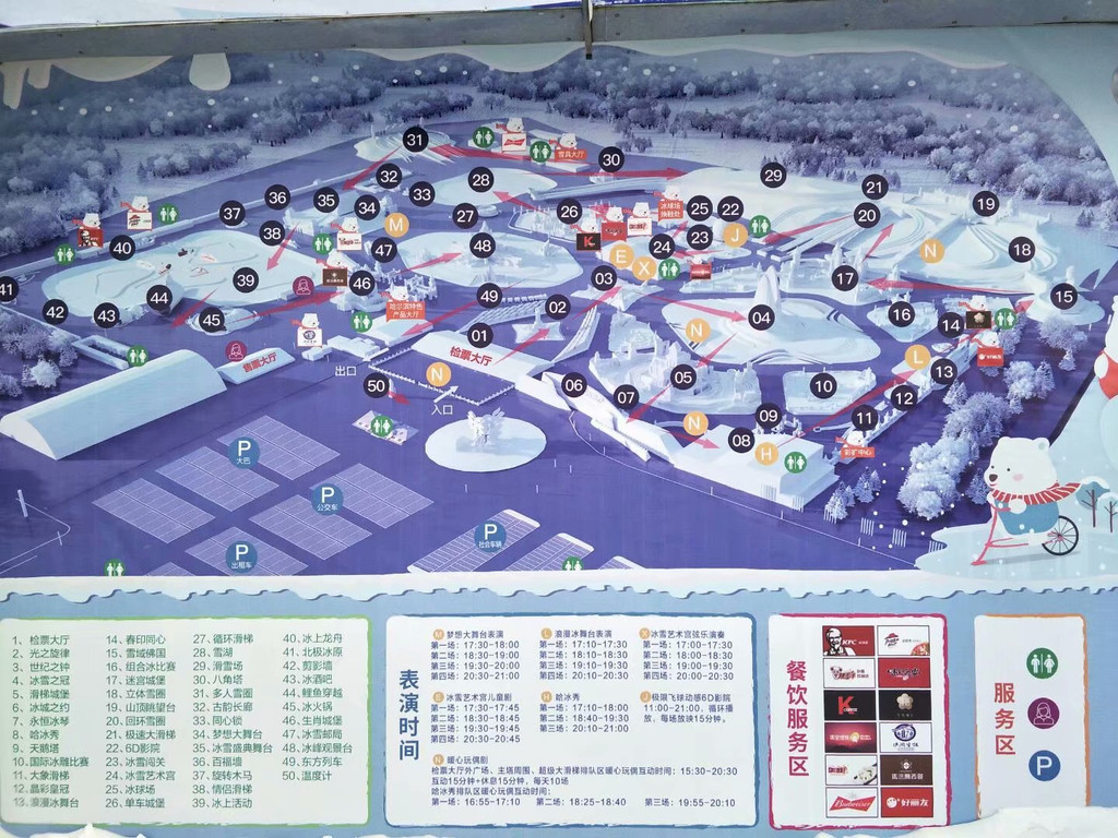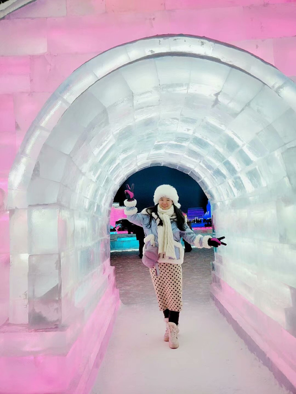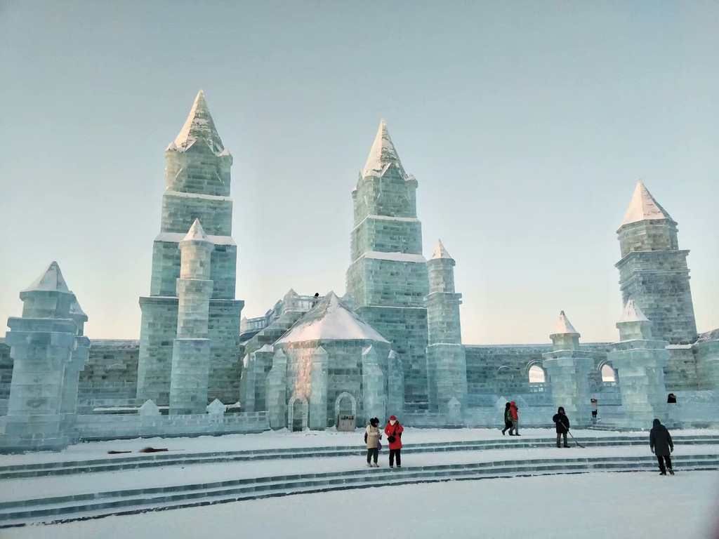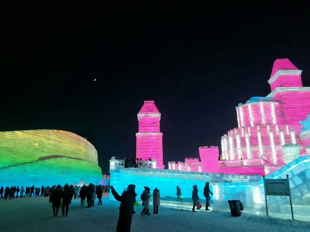 在中央大街逛罢,就要去此行的最后一站冰雪大世界了,这个时候才意识到,在这样的一条路上旅行,没有一个靠谱的交通工具真的太难了,也许你大部分的时间就花费在了等车上,平时半小时的路程,到了哈尔滨也许要用两个小时,到了冰雪大世界没走几步就感觉到真冷,比起亚布力,比起雪乡,比起市区,这里是真冷!人只有一直不停的走,才不会被冻住,手脚才会暖和,戴着口罩前行,哈气都把口罩打湿了,呼出的热气上升到帽檐上,额头上的帽檐前端都有点积冰,眼睫毛长的睫毛上都是一层冰霜,后来索性不戴了,但脸又冻的生疼。暖宝宝已经用到了极至,都还能感觉到从下而上寒彻心骨的那种寒冷。匆匆的看了几个标志性的冰灯以后,就直奔哈冰秀场馆外面排队去了,之前研究了攻略知道大滑梯和哈冰秀是重磅,可目测大滑梯排队至少上千人,得等两个多小时,果断放弃掉,排了半小时队进了哈冰秀场,事实证明,此举太过明智,严重推荐冰雪大世界的必选项目绝对是哈冰秀,一定一定不要错过!而且冰雪大世界的白天和晚上是不一样的效果,建议一定要早去,先玩项目再看演出,然后等天黑再观灯。而且最最重要的是,一定要穿的够厚,不然分分钟被冻的怀疑人生。