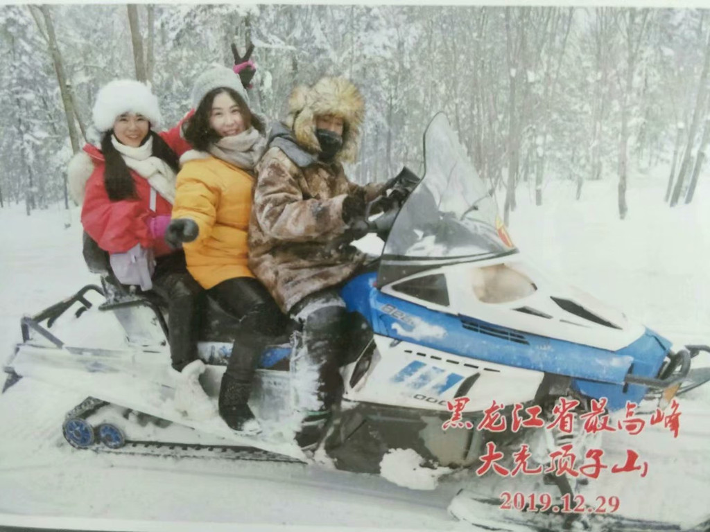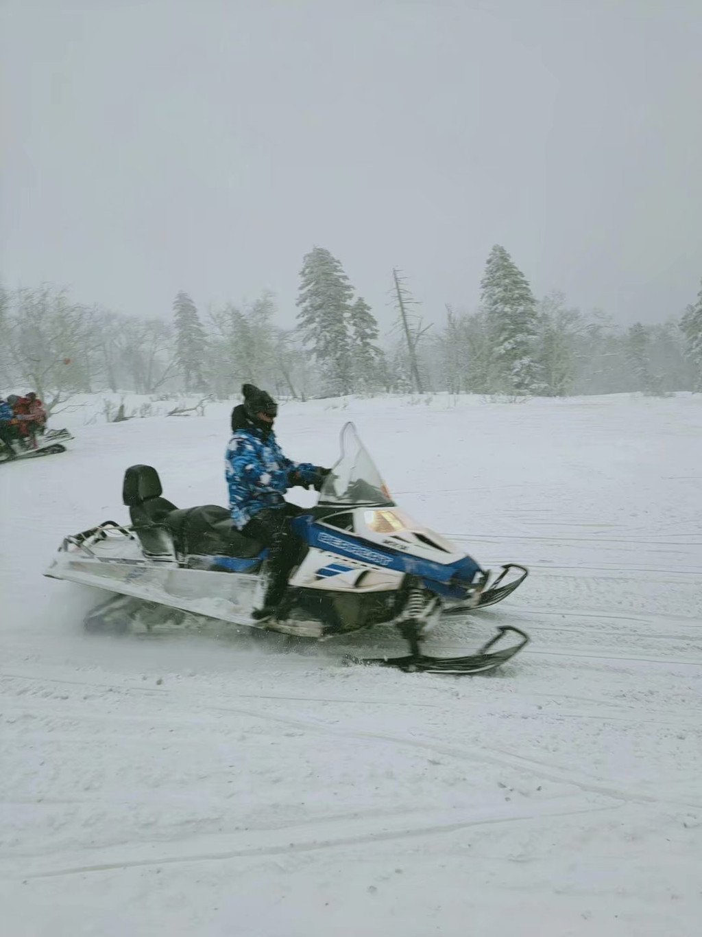 穿过威虎寨,跟土匪们对完暗号,就可以坐上雪地摩托车直奔大秃顶子山顶了。一坐上雪地摩托,我整个心脏就提到了嗓子眼,惊险刺激之感绝不亚于高速过山车,飞驰的摩托、呼啸的山风、漫天的狂雪、天地间一片纯白,山间回响着我的惊声尖叫声,一直响彻到山顶,我叫的声音越大,摩托骑手油门加的越大,颠跛的就越剧烈,坐在后排的我感觉自己分分钟就能被狂甩出去。真的太佩服他们的胆量了!飞驰到了山顶下了车,我的腿基本走不了路,完全开始打颤,加上山顶的风雪极大,绝对可以达到六、七级风力,没走两步,眼睛已经完全睁不开了,一不留神,就会被风推着走,一个踉跄,就会摔个仰翻天,最后实在摔的爬不起来了,干脆坐在地上喊起了妈,不知道我妈在家是否耳根子发痒了?心想你出去狂野的时候咋没想起你妈呢!
