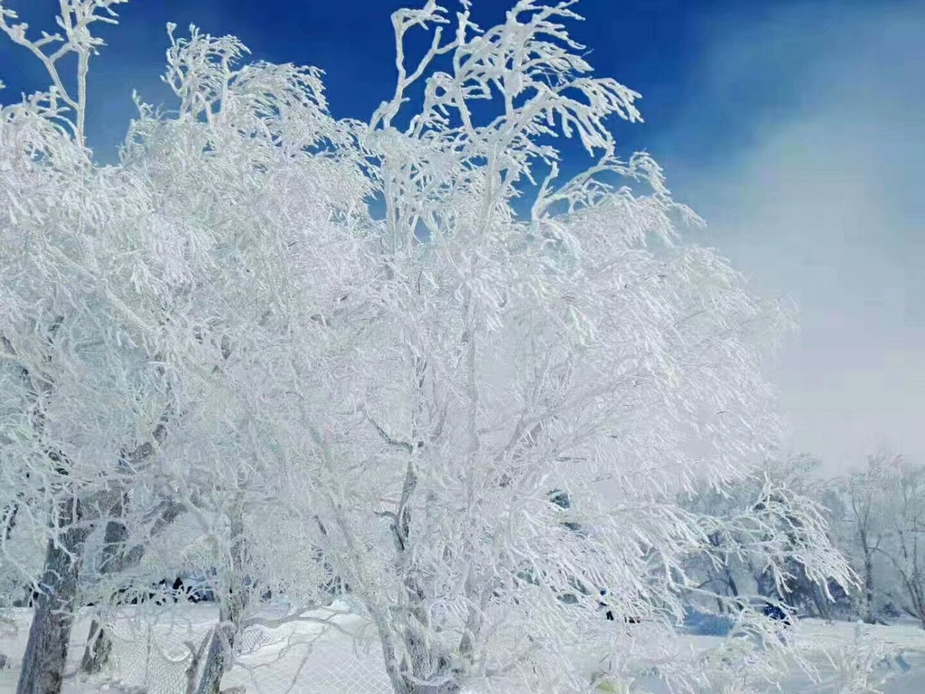 感慨完毕,稍做休整,进入驿站,看到外面一米多长的冰凌子,按导游的提示,把所有御寒的装备都穿上,准备为下一步徒步进入牧雪山村和十里画廊做好准备。 又是一顿难以言表的团餐以后,我们到达徒步景区,与导游约定好集合时间后就开始自由活动,先坐上雪圈,由越野车开道,穿越在雪道上,天空是数不尽的雾淞闪过,寒风像刀子一样划过皮肤,这个时候东北御寒三件套起到了决定性的作用,帽子、手套、围巾是必备的,尽量不要让皮肤裸露在空气里,不然你就会体验到无比冰爽的感觉。玩完雪圈,我们开启了徒步冰雪之旅,途中还见到了传说中的东北神兽“傻狍子”,据说这货如果一枪没被猎人打中的话,还会再返回看看猎人走没走?如果猎人再打它,它会把头埋到雪里,只露出带着一撮白毛的屁股,还真不是一般的傻。跟傻狍子愉快的合影完,进入牧雪山村,穿过十里画廊,亲临实境,多了一种融入童话世界之感,与大片大片的雪原接触,满目都是大片大片的白色,像棉花堆,又像云层,更像是用泡沫堆砌出来不真实的世界,每个人都逐渐抽离现实,生出幻生幻灭之感,每个人都禁不住涌入其中,倒进雪地里,愉快的翻滚,像是找寻了到了失去多年的童真,跟雪接触,除了冷,除了开心,没别的毛病!