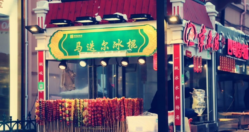而这些欧式风格建筑中间或分布着不少俄罗斯商铺,如知名的马迭尔冰棍、华梅西餐厅、秋林里道斯红肠、大列巴等老字号美食。