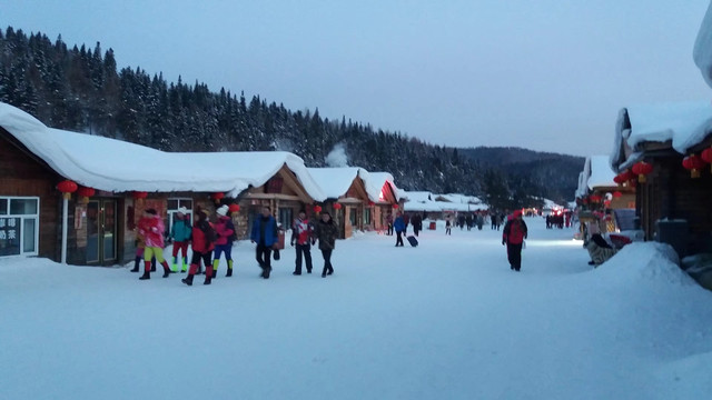 雪乡两边的山上修了栈道,可以登上山俯瞰,屋檐下挂了装饰的灯,映着厚厚的雪,真的很像童话王国。