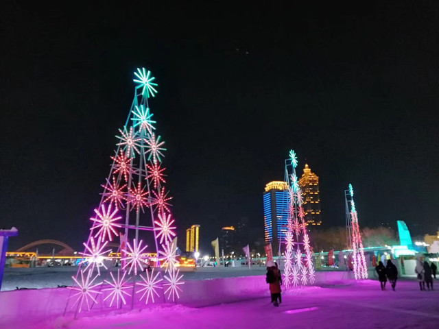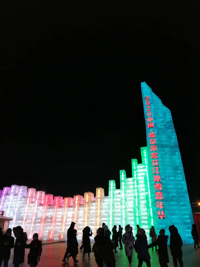 到了晚上,天完全黑了,冰雕显得更亮了,但室外的温度也一下子降了下来,手机拿在手上很快就会冻没电,只能贴了暖贴放在羽绒服里面的口袋里。