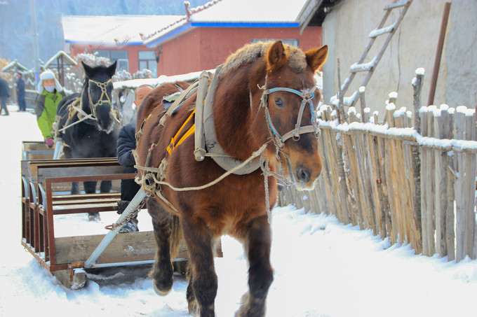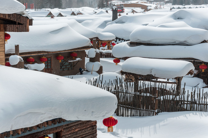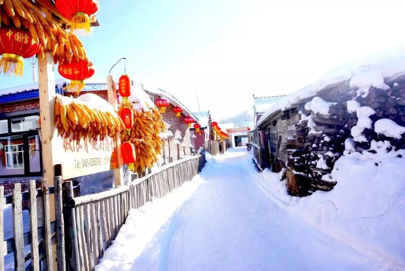 雪谷巷弄里有很多原生态土坯房的小屋,屋檐下长长的冰凌,屋顶上厚厚的积雪,屋前木质的栅栏,踏足厚度盈尺的积雪,踩在上面嘎吱作响,腿有一半陷入了雪中。大红灯笼高高挂起,屋檐下,大门旁边,和灯笼为伴儿是的玉米棒子,喜庆再加丰收的喜悦,衬托洁白的雪野,美得恰到好处。