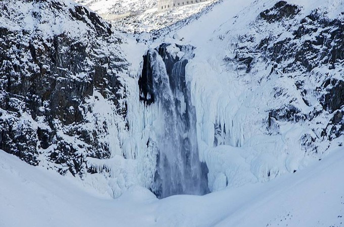 徒步开始后,一路走走停停,只微微生汗,不冷不热,很是舒适。随处可见冰瀑。随处可见不冻的泉眼。
