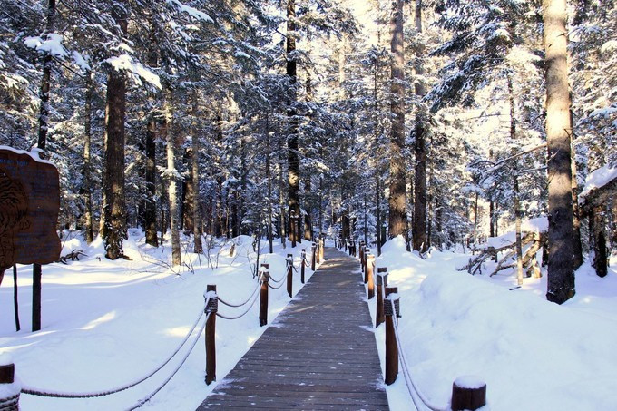 脚下是林海雪原,头顶是湛蓝的天空,暖阳当头,登山途中,阳光透过茂密的森林,投下束束金色的光影,厚厚的积雪,一尘不染。喜欢雪的旅人,痛痛快快地撒撒野,肆无忌惮地玩玩雪,在雪地多来几个360度大翻滚,让爱打雪仗,堆雪人的户外狂人,更加方便地一展身手。
