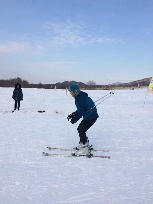 午餐后,大家马不停蹄奔向滑雪游乐场,初级的滑雪场还有一块天然的冰面,冰上打陀螺,玩冰车,都快乐疯了,铁锹变成了滑板,玩得不亦乐乎。各种搞怪,各种快乐,诠释各种喜悦和欢乐。对于从不会滑雪的我,摔了很多次,不亦乐乎,当我战胜自己的时候,拿出勇气,我开始可以稳稳地滑下去了。