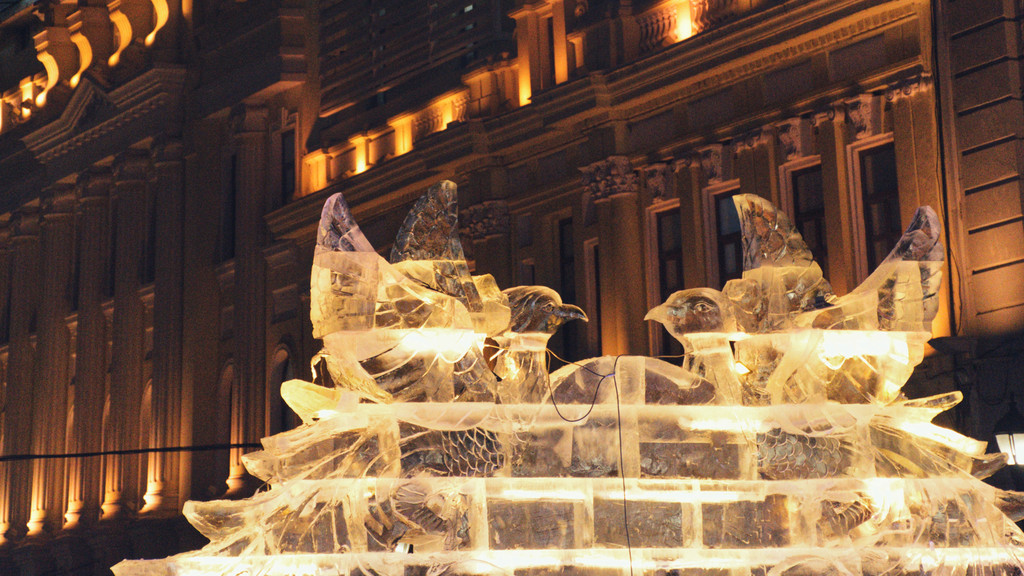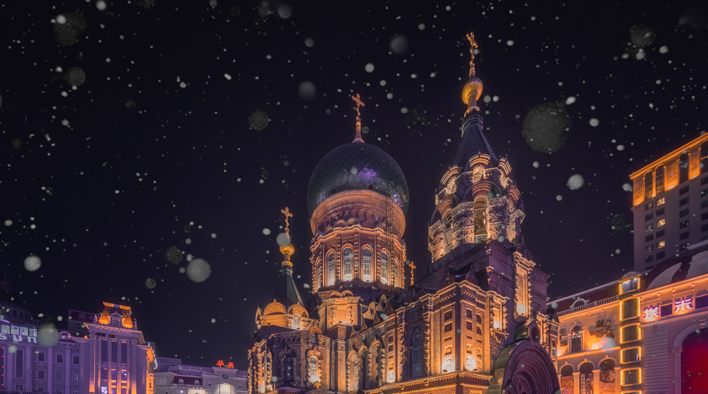 而冬天的中央大街上,冰雕也四处可见,有带有民族色彩的凤凰冰雕,有充满童真的企鹅冰雕,还有浪漫的玫瑰花冰雕......每当冰城降雪的时候,大街上白茫茫一片,夜里流光溢彩的灯光照在冰雕上,别提有多美了。