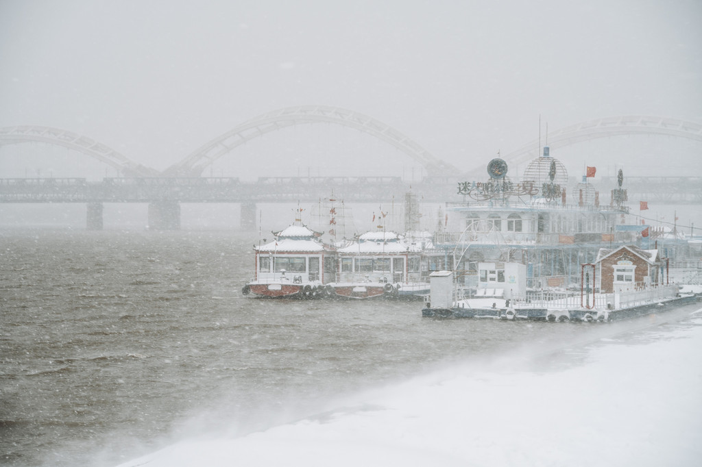 冻得结实的松花江冰层大致有半米多厚,冰面上可以走人和马车,甚至还有人把车开到了上面,远远望去,江面的游艇亦被“冻”住,这种场景以往只在电视里见过。走在冰面,脚下积雪咯吱作响,如履平地,很难想象冰层下是滚滚江水。作为南方人看什么都觉得新奇。