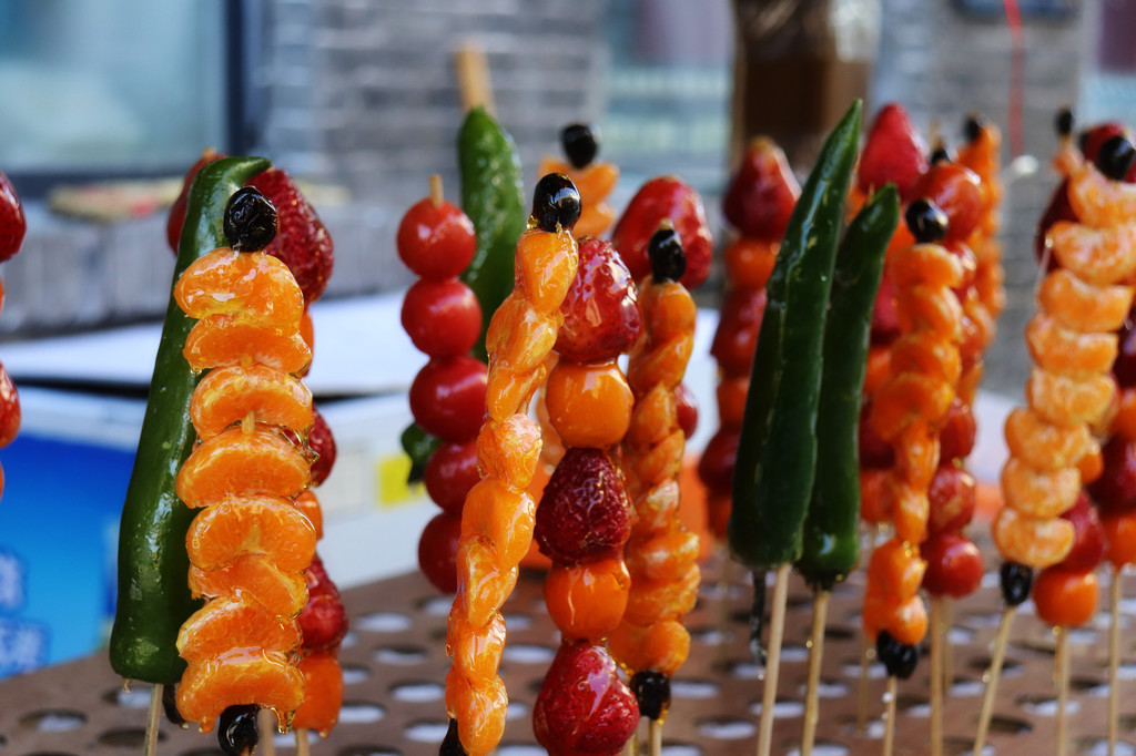 松花江上另一道靓丽的风景线则是冰糖葫芦,每走几步就能看见一处。而这里的冰糖葫芦万物皆可串,红艳艳的山楂球和各种水果自然不用多说,西兰花、猪蹄、鸡爪可就新鲜了,闪着焦糖,晶莹剔透,光是看着便令人齿颊生香,非买走一串不可。