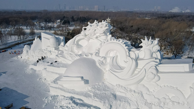 2020年雪博会主塑是中国祥龙巨型雪雕。中国一直被誉为东方巨龙,华夏儿女也被称之为龙的传人,龙的是中华民族最具代表性的图腾之一。航拍下,这个条雪龙刻画得非常生动形象,龙头昂首挺拔,龙身粗壮有力,龙爪奋力张开,龙尾灵动跳脱。