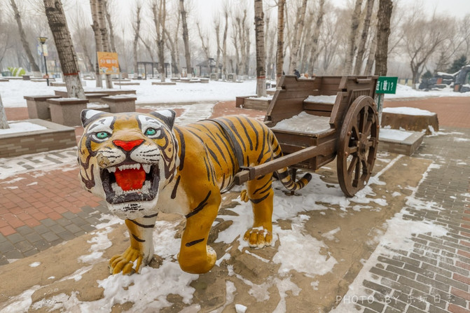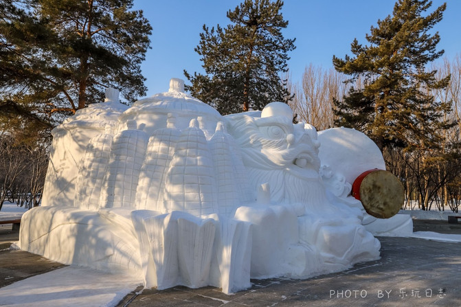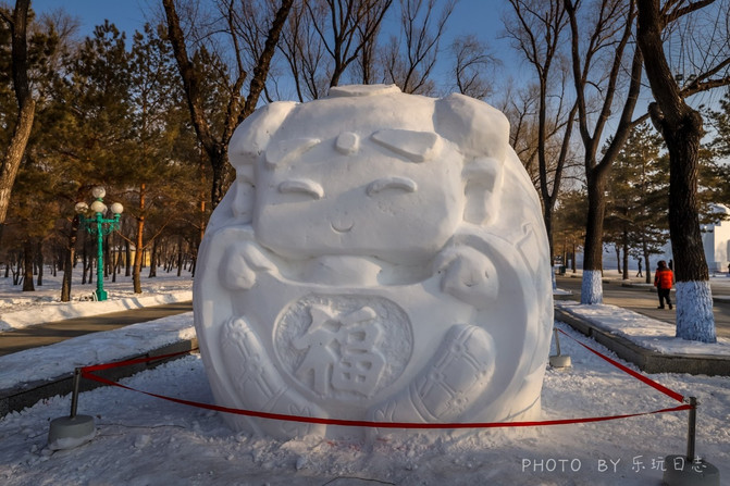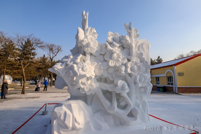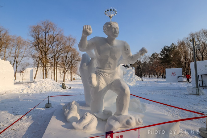雪雕基本上都是沿着道路两侧摆放,种类有《温度计》、《飞雪迎春到》、《世纪回眸》等等,旁边还有互动区,看完雪雕可以坐上雪山,坐轮胎感受一下雪地上的速度与激情。