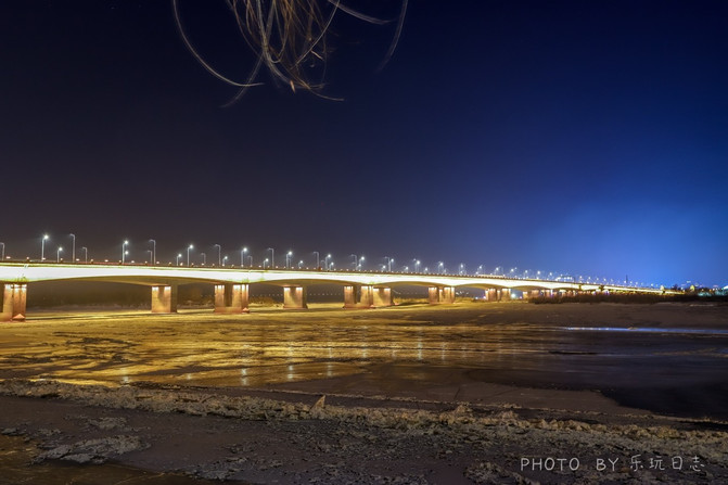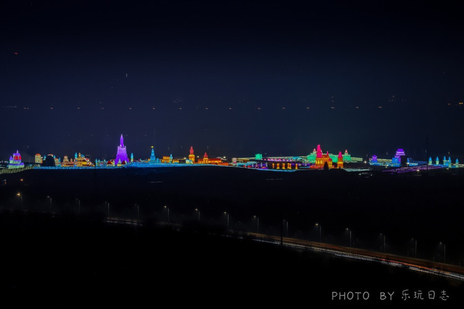 松花江上的公路大桥灯火通明,而右边那个发个蓝色亮光的,是冰雪大世界。