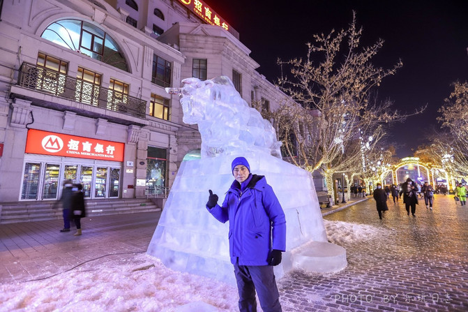 中央大街上有许多的冰雕,明年是牛年,跟牛雕合照,希望明年继续牛气冲天。