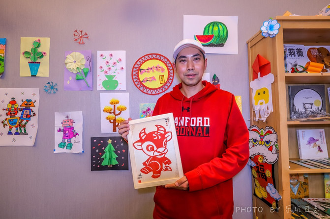 本地传统技艺体验有东北剪纸 、制作冰糖葫芦、烤冷面等,这是我体验东北剪纸,明年是牛年,所以剪了只牛。