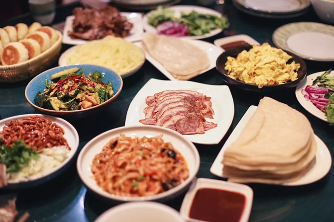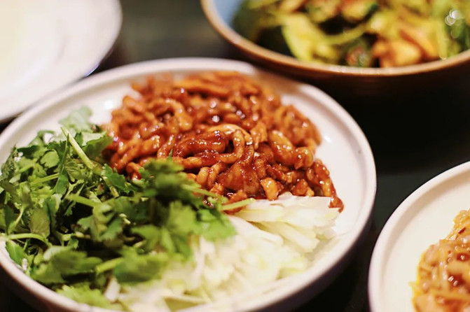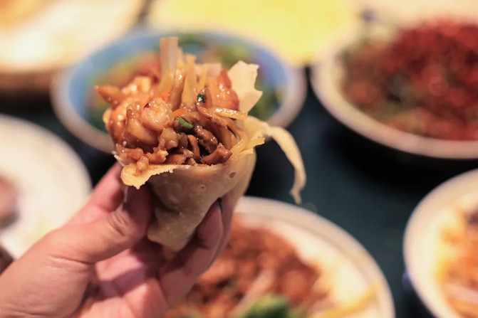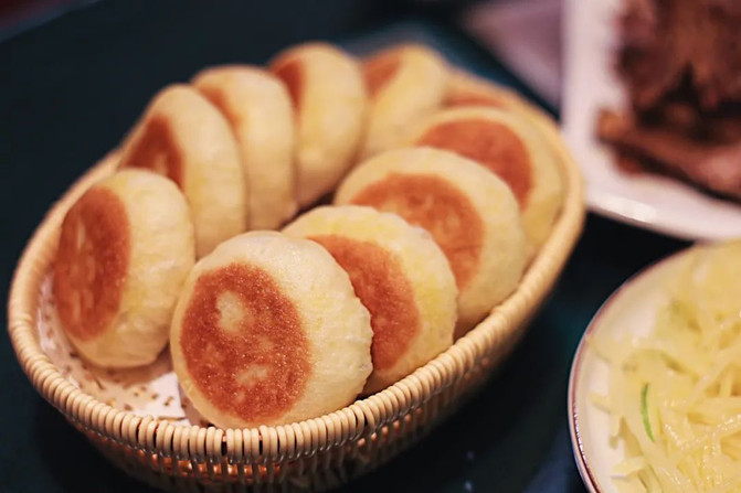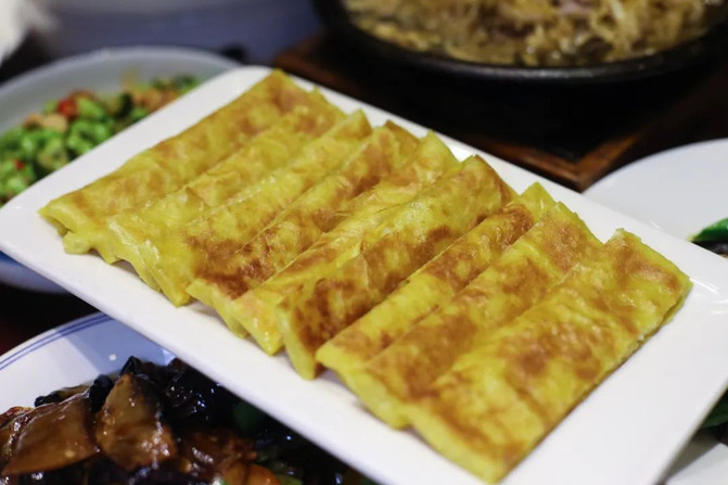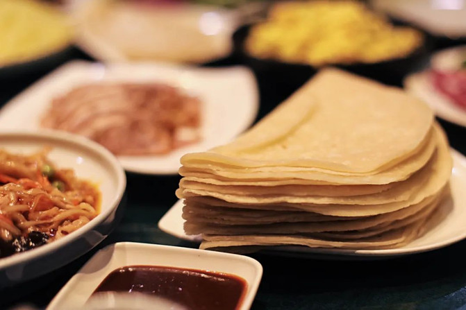 这里的面饼薄而不破,你可以尝试普通的春饼,或者是更薄更筋道的筋饼,卷上京酱肉丝、嫩炒鸡蛋、土豆丝等各种炒菜,一口咬下去,香味四溢。