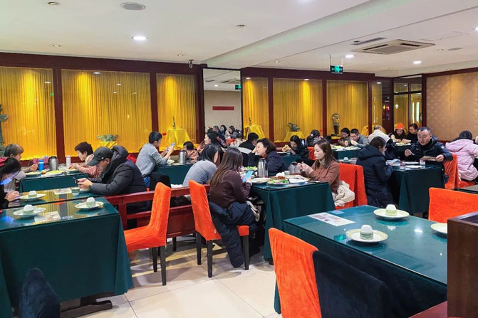 那日逛哈尔滨必打卡的中央大街,中午就选在中央大街店的老昌春饼,位于地下一层,餐厅环境是墨绿配亮橙。