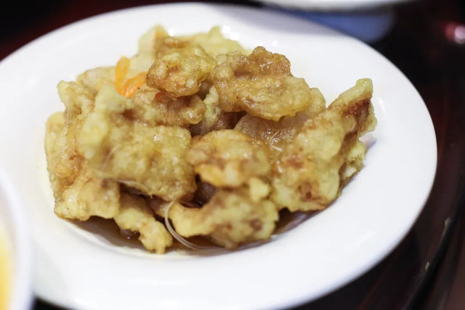所以这是到老厨家必点的一道菜肴,这里的锅包肉是干汁的,皮酥肉嫩,酸甜搭配刚好,酥脆可口。