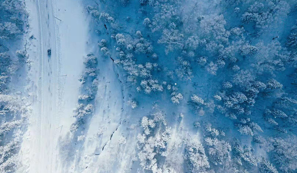当无人机飞向高空,看着屏幕下的阳明滩大桥,这片被雪渲染过的世界,才是冬天该有的样子。