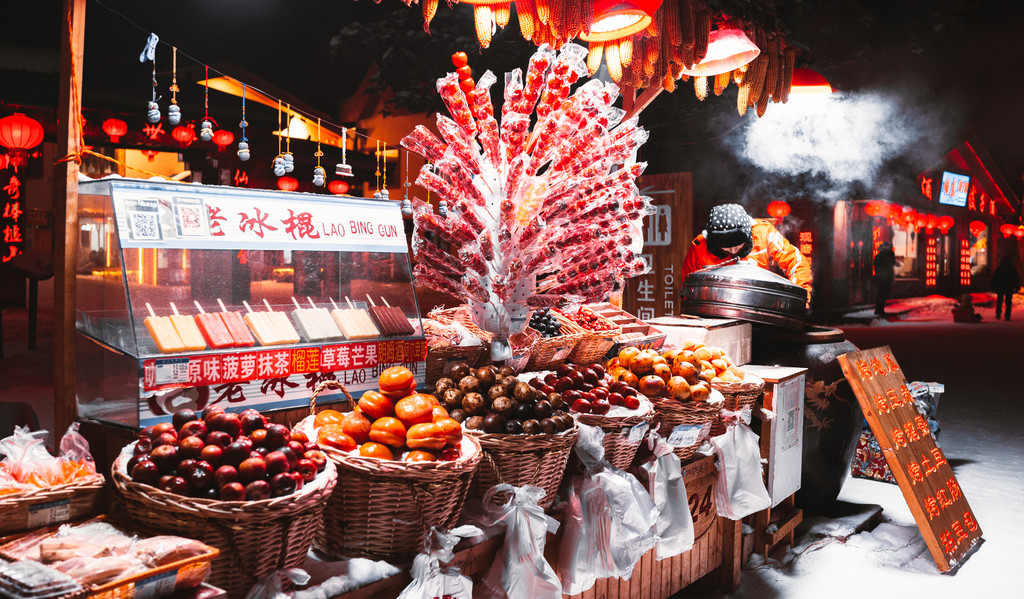 除了冻梨,其他水果也是冻的,所以冰糖葫芦在这里的才正宗,不冻哪儿来的冰呢,是吧?