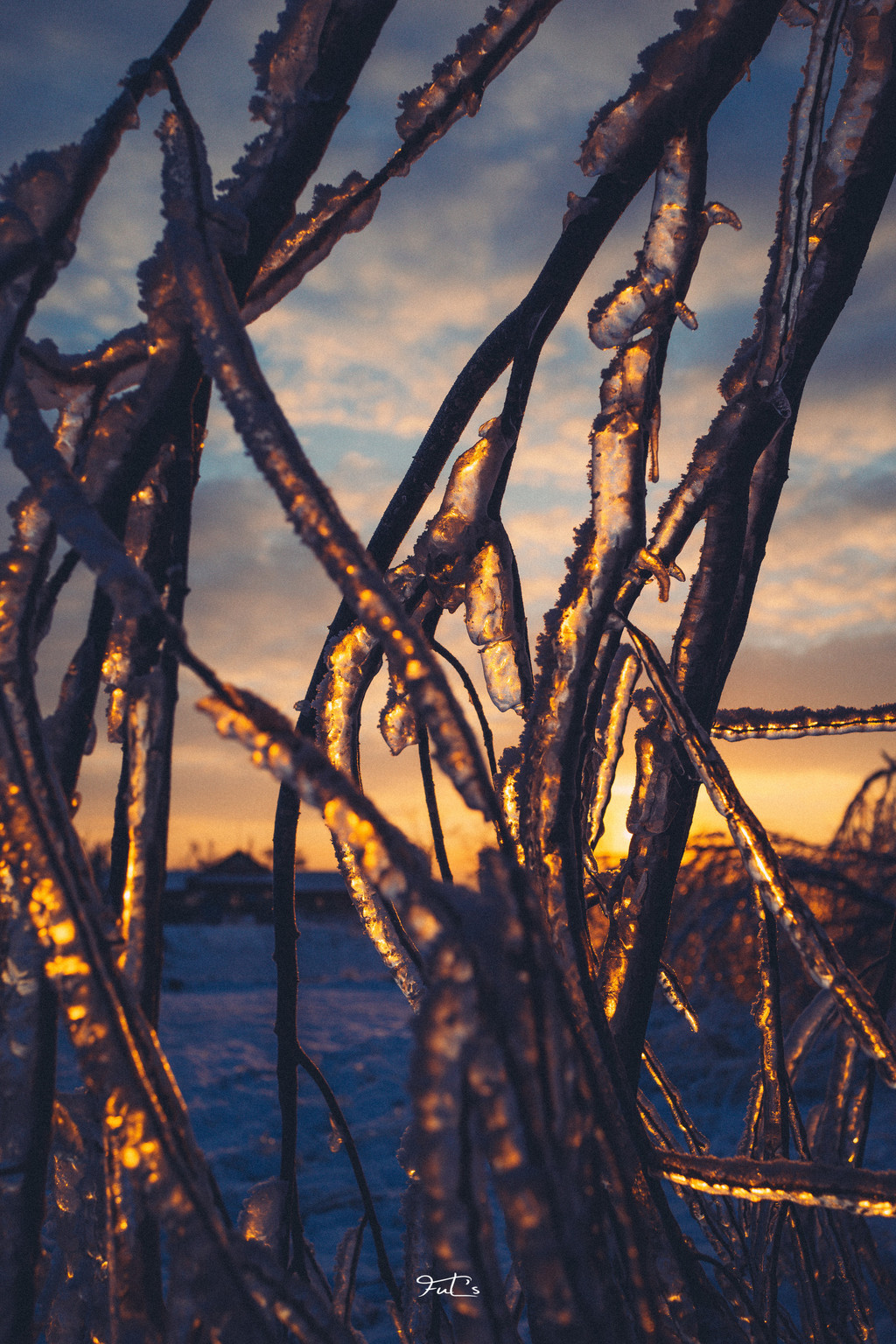 寒江雪柳,玉树琼花,江风吹拂银丝闪烁,天地金灿灿一片,犹如被尘世遗忘的仙境。