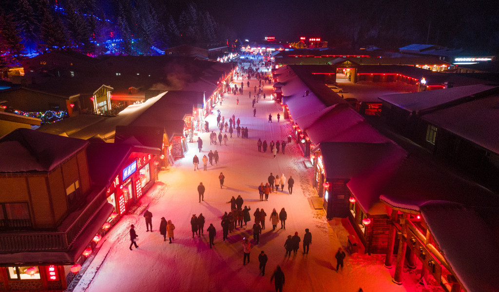 到了雪乡,人很多,张灯结彩的样子像是过年一般。走在雪韵大街上,两旁的小木屋别具风格。