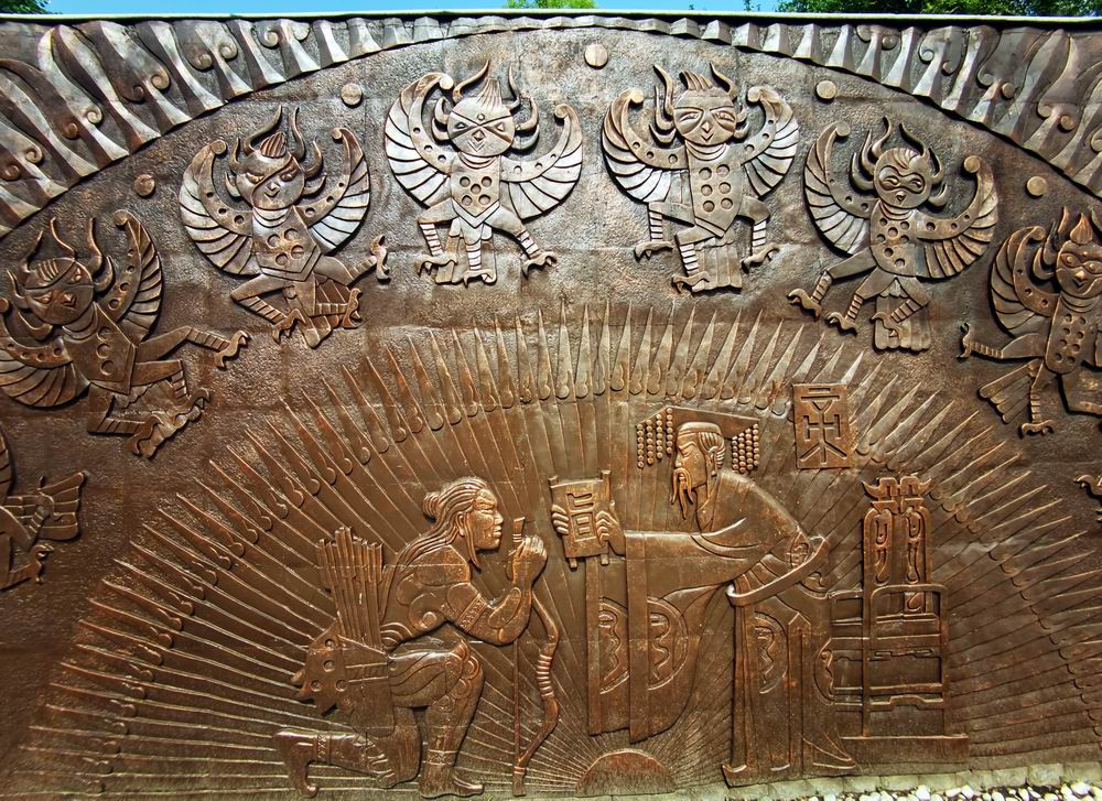 浴日台的浮雕,讲述了一个远古的神话故事——后羿射日。传说,远古的时候天上有10个太阳,弄的人间大地干裂、民不聊生,后羿拔出箭射下了9个太阳,只留了一个,在天上温暖人间。
