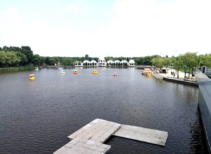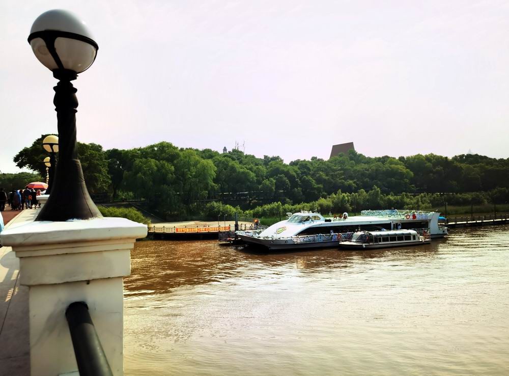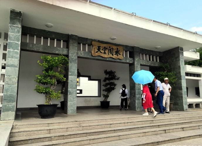 水阁云天主景面积 1515 平方米。主要采用现代园林造景手法,凭水而建,分长廊、边廊、方阁三部分。图为远眺水阁云天码头。