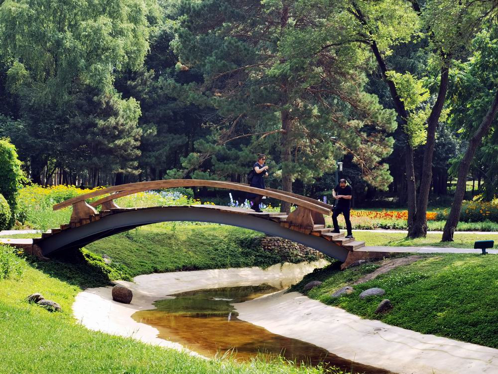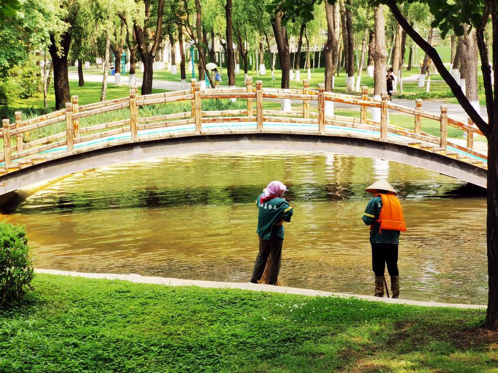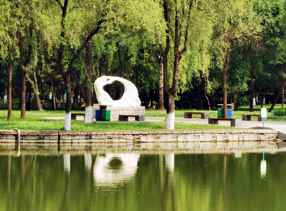 太阳湖亭桥如画,倒影落入湖水之中,形成“亭桥映柳”的景观,令人赞叹。