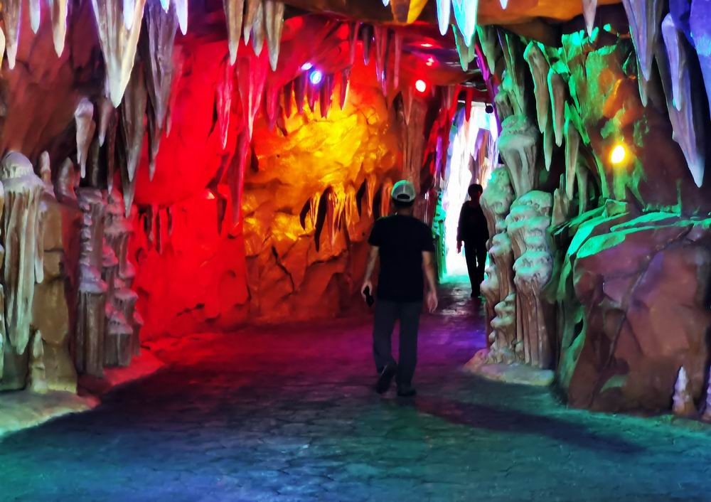长廊内有仿自然的溶洞,曲径通幽、灯光掩映,与仿山岩的摩崖石刻、岩化、石钟、石笋相映成趣。